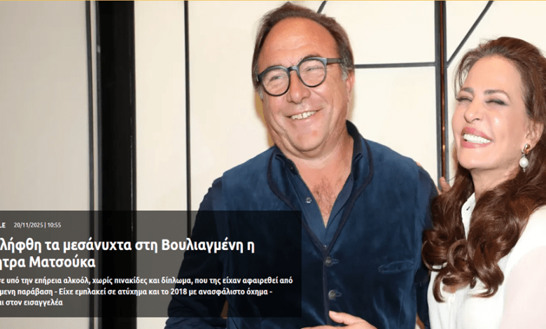 Η γνωστή ηθοποιός Δήμητρα Ματσούκα, σύζυγος του πρώην Ευρωβουλευτή και γνωστού επιχειρηματία Πέτρου Κόκκαλη, συνελήφθη τo βράδυ της Τετάρτης 19 Νοεμβρίου καθώς σε έλεγχο που της έγινε βρέθηκε να οδηγεί χωρίς δίπλωμα και να τρέχει με υπερβολική ταχύτητα .